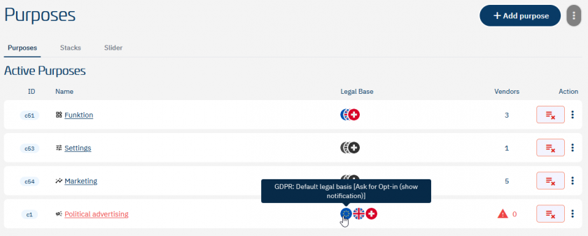 - Click on the Europe-flag under Legal Base for the purpose to edit the legal basis of the purpose