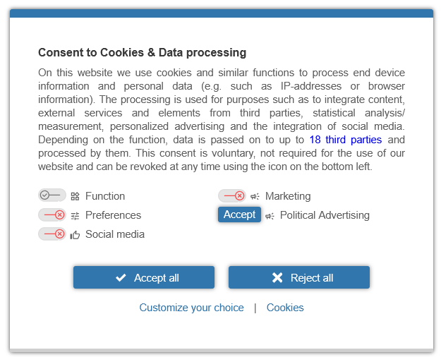 When a purpose is set to Explicit Opt-In, it will show a consent button instead of a toggle. When clicking the "Accept all" button in the consent banner, the purpose will not automatically be accepted - the user will need to manually enable the purpose. (Same for vendors that are assigned to the purpose.)