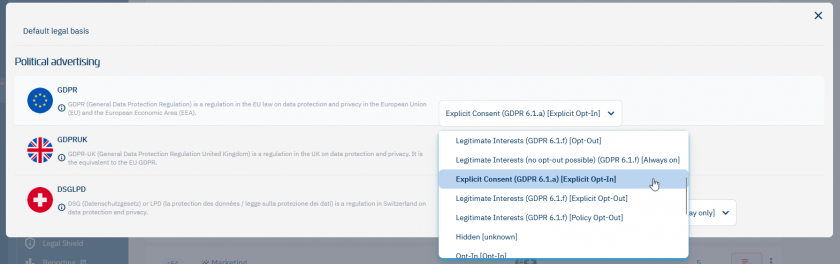 - We recommend setting the legal basis to Explicit Opt-In (Explicit Consent)