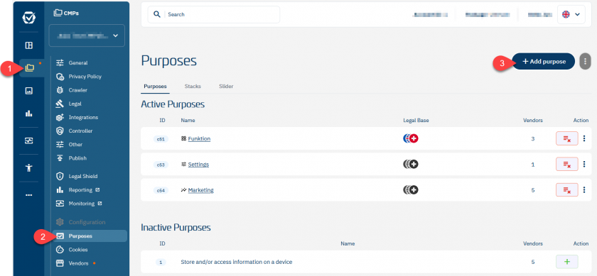 - Login to your account and navigate to Menu > CMPs > Purposes