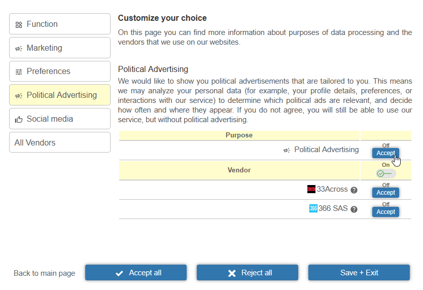 Political advertising and targeting are regulated by Regulation 2024/900 and require higher levels of transparency and targeting. In order to ensure you collect valid consent for political advertising, we recommend following the below steps.